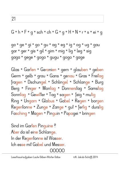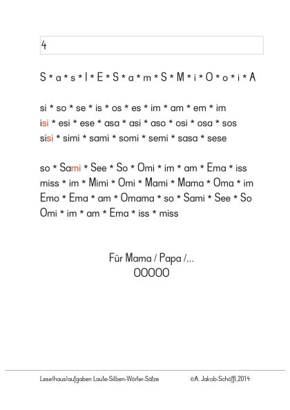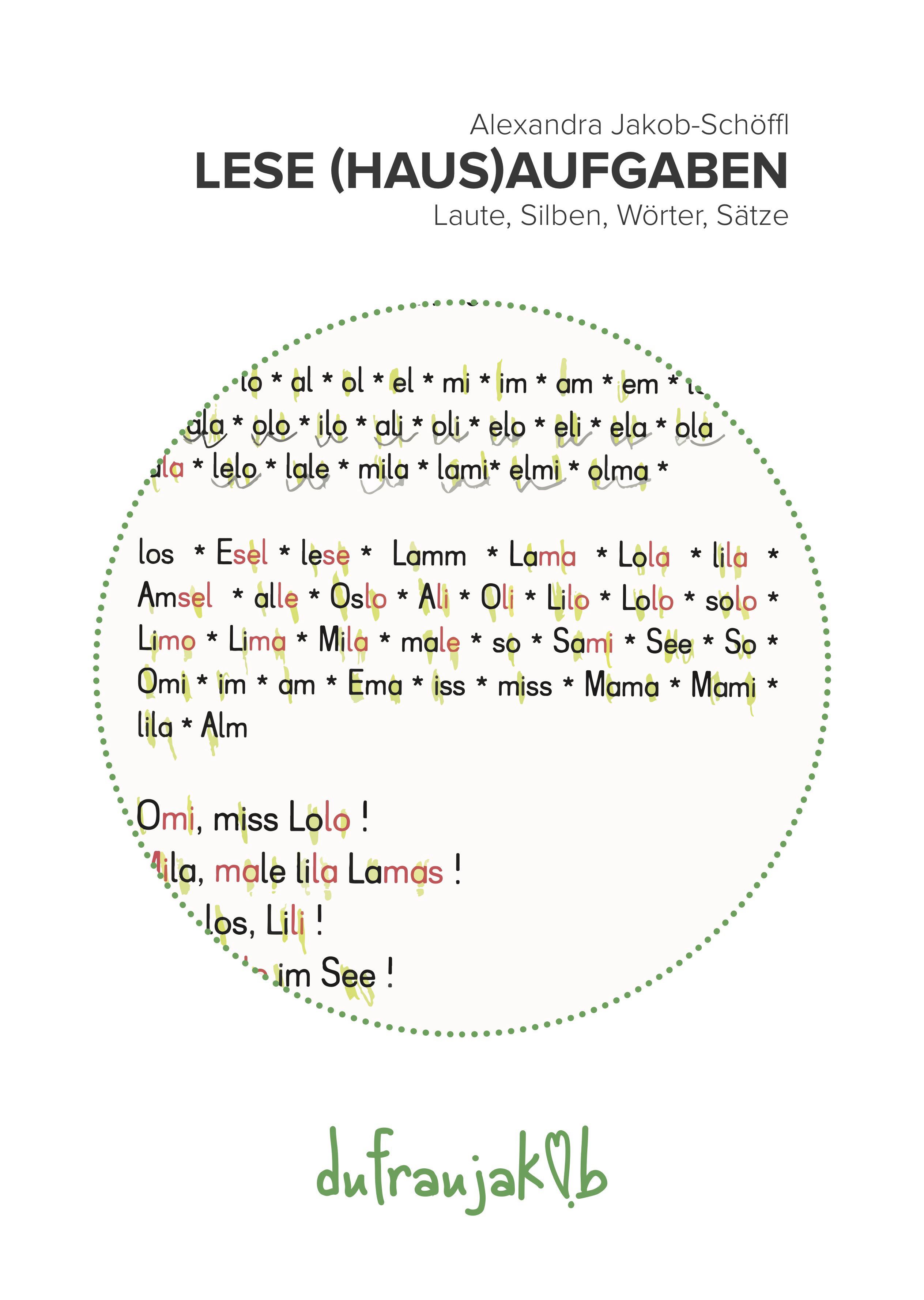 Die Lese(haus)aufgaben sind geeignet zum Erlernen und Üben des Lesens. Auf 45 Seiten wird jeder neue Laut als Teil einer Silbe, als Teil eines Wortes und später auch in Sätzen geübt. Das Buch folgt der Erarbeitungsreihenfolge (siehe About), d.h. die Texte beinhalten nur bereits erlernte Laute.