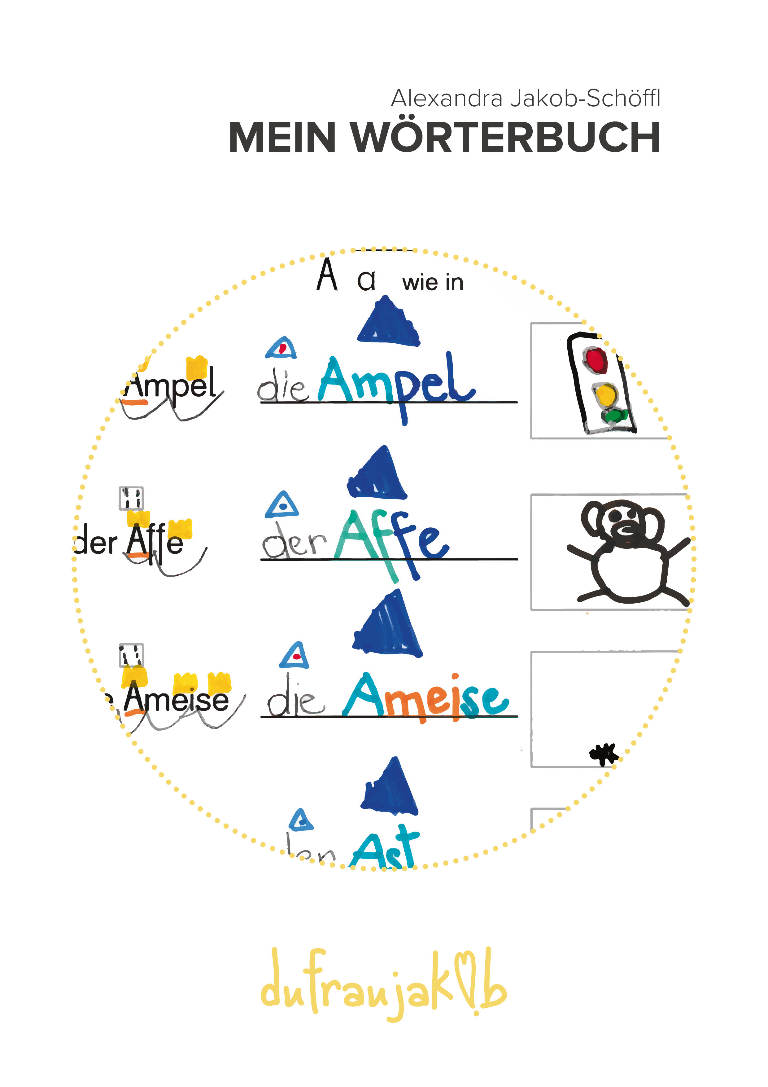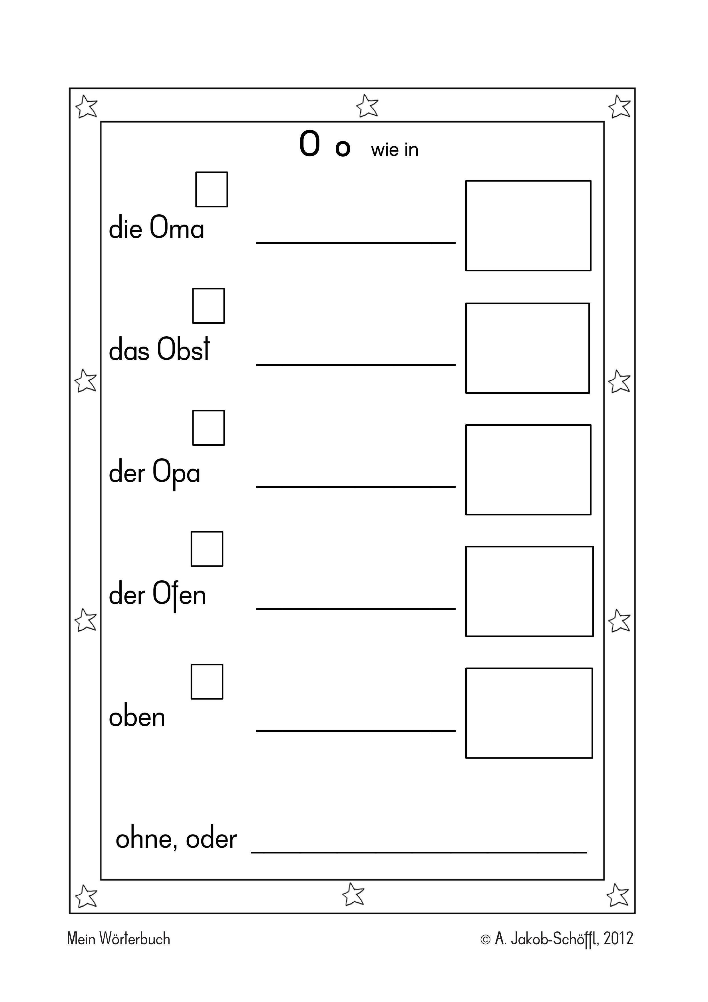 Mein Wörterbuch ist ein Anlautlexikon, dass zur Sprachbetrachtung einlädt. Zu jedem Laut gibt es eine Seite mit fünf Anlautwörter, die untersucht und geschrieben werden können, Sie werden mit einer Illustration des Kindes verbunden. Natürlich werden die Wörter auch wiederholt gelesen. Teilweise gehören diese Anlautwörter zu den Lernwörtern.