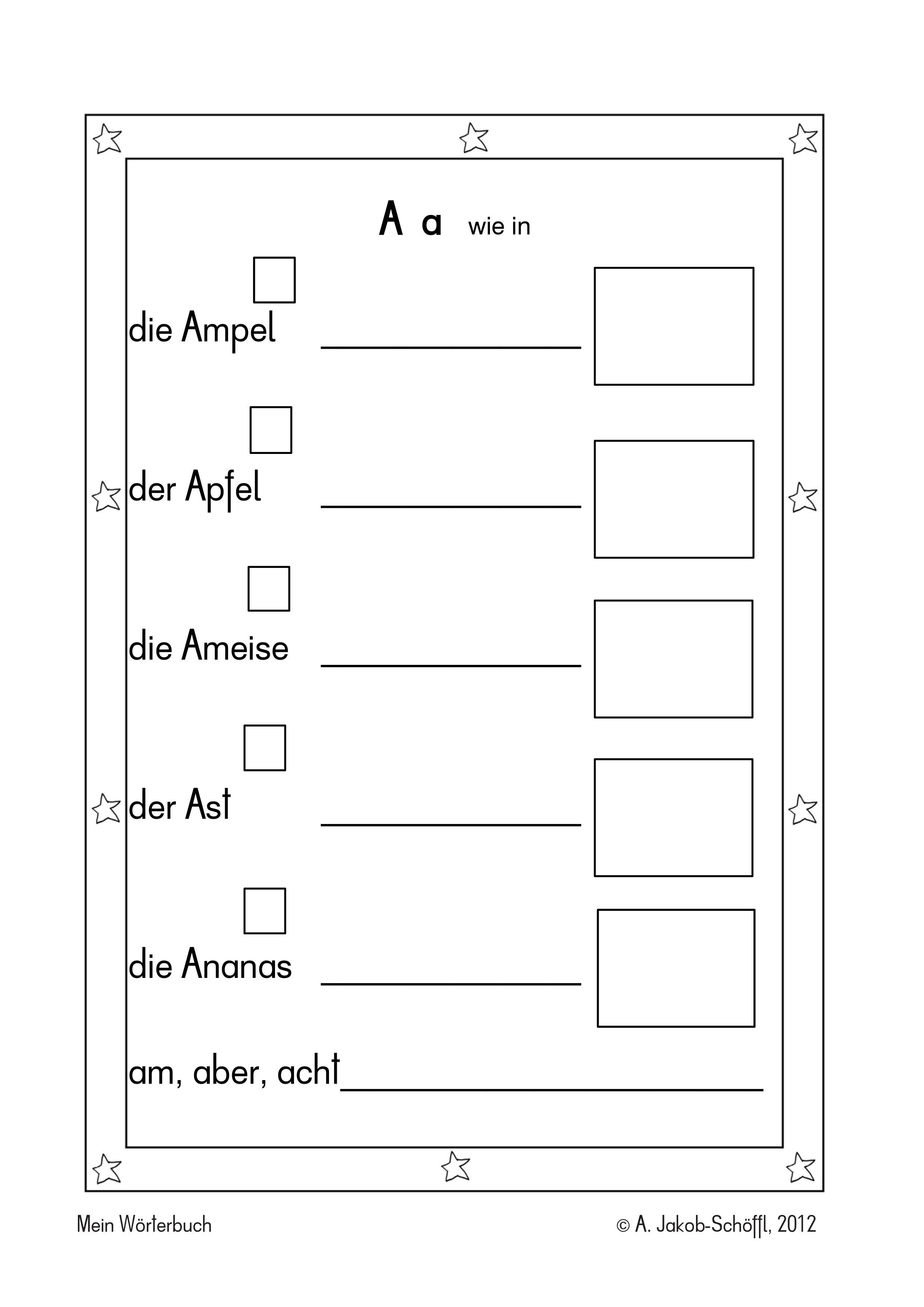 • Auf der Zeile unten ist Platz für andere Wörter oder Namen aus der Klasse, die mit diesem Buchstaben beginnen oder mein Lieblingswort mit „A“,...
